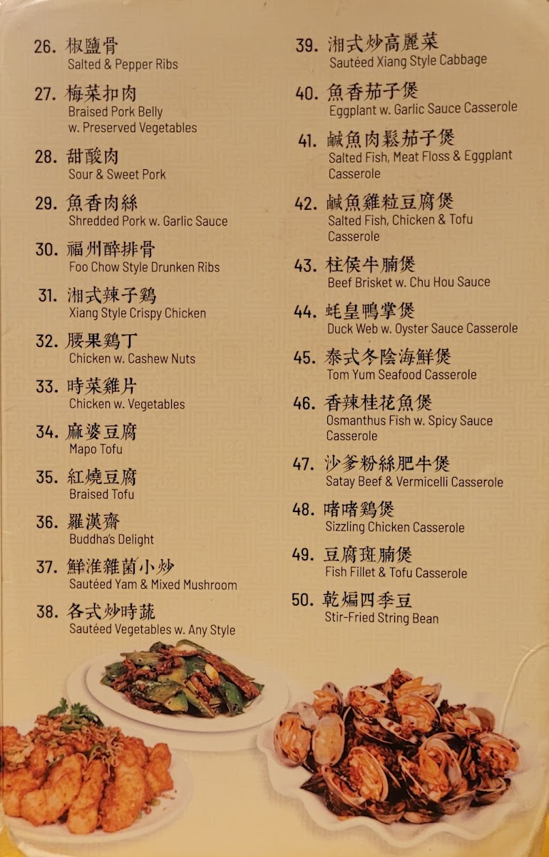 Pork Dishes: This section includes various preparations such as Peking pork chop, sweet and sour ribs, spare ribs with black bean sauce or bitter melon, salt and pepper pork chop, shredded pork with taro or garlic sauce, steamed pork patties with salted fish, and Mao's braised pork belly.