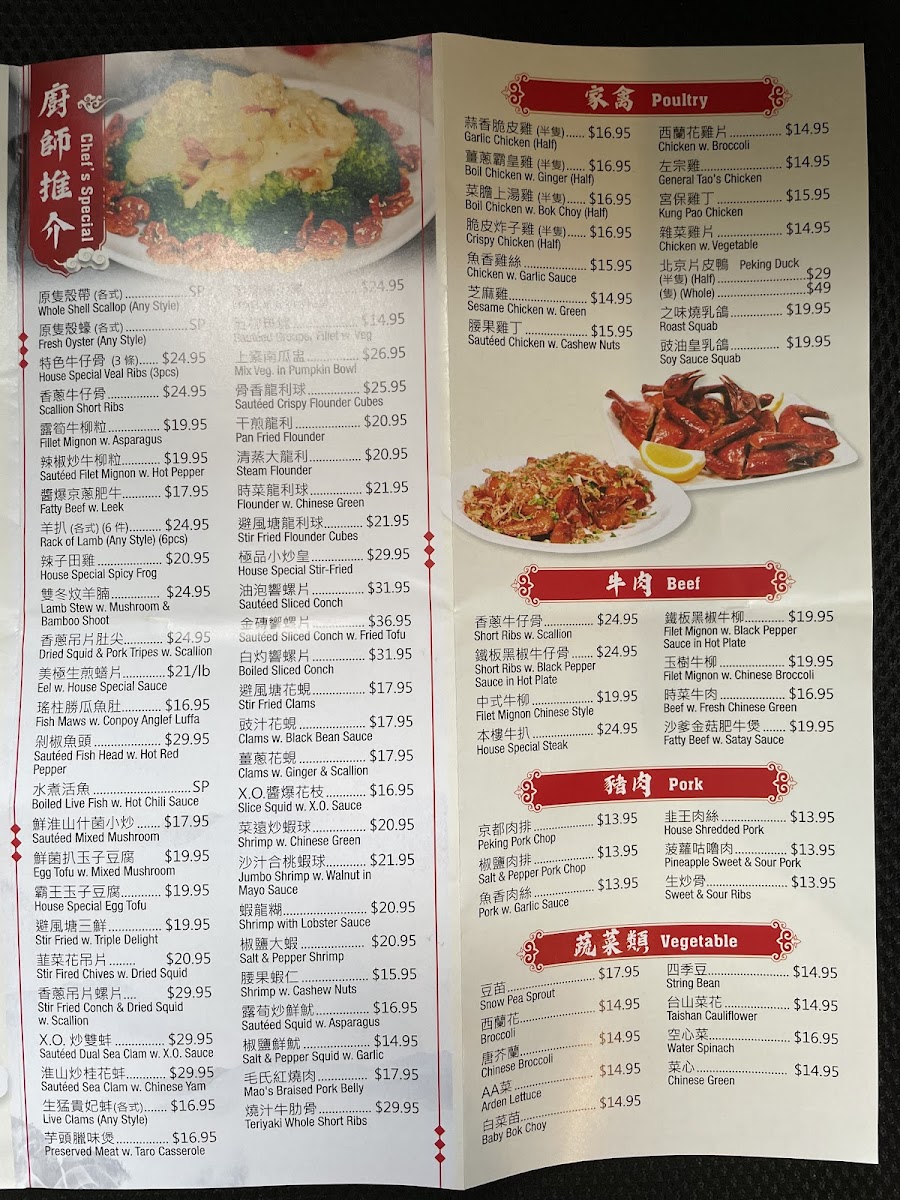 Seafood and Specialty Items: The menu includes lobster prepared with ginger and scallions, conch sashimi, steamed fish, oyster with ginger and scallions, Australian green lip abalone, walnut shrimp, clams, and a variety of cold platters like Cantonese style cold platter. Other items include Peking duck, roast piglet, pig tripe with sour cabbage, lamb chops, mushrooms sweet, soy sauce noodles, beef chow fun, and beef pan-fried noodles.