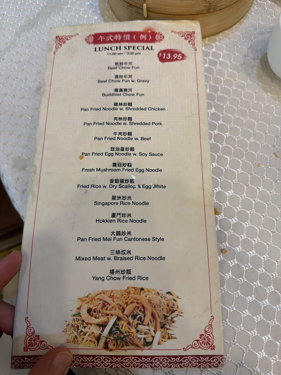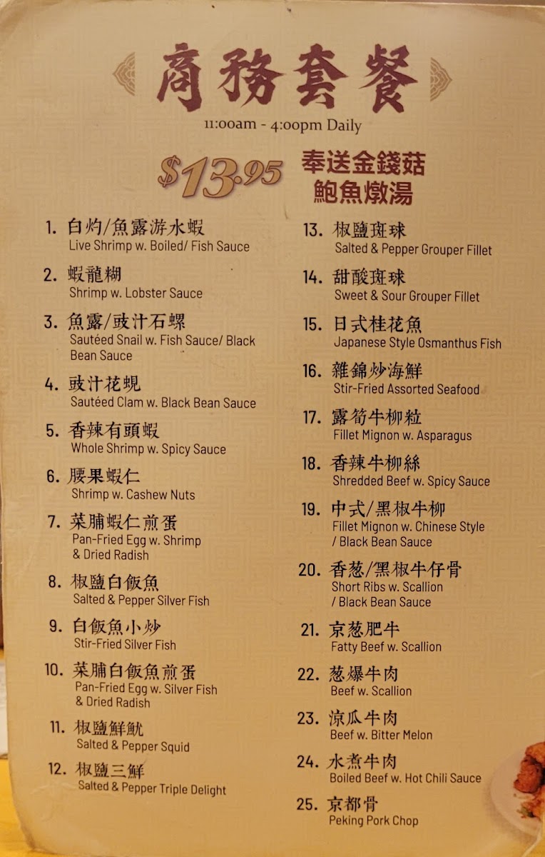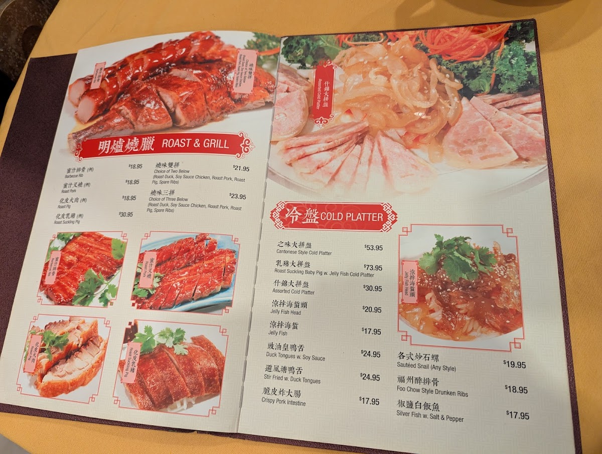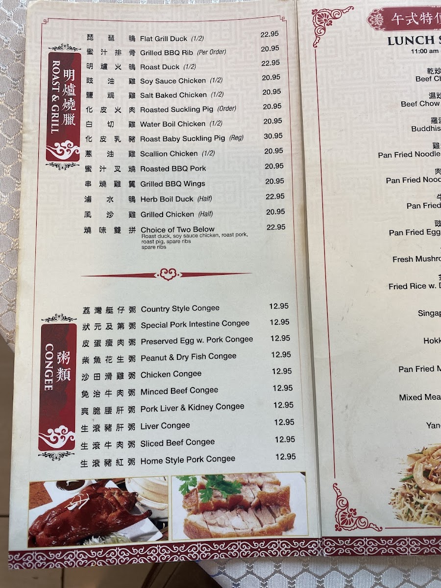 This menu suits casual dining occasions, ranging from light meals such as dim sum and cold platters to more substantial dishes served throughout the day. The variety accommodates quick orders as well as more leisurely meals, with dishes prepared in traditional Cantonese and wider Asian styles.